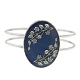 Indigo blue, organic inspired florals, cuff style bracelet- all of your summer fashion must haves in one stunning bracelet design! Two silver tone bands connect at a hinge and clasp together at the center for an easy to wear and comfortable jewelry piece. A large oval medallion covers the clasp at the middle and makes a bold statement everyone will be complementing. The indigo blue enamel is accented with unique branch-like silver tone floral designs.