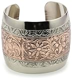 An exquisite cuff bracelet demonstrating the beauty of art with a two toned silver and copper tone finish under a romantic floral etched design.