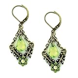 A lovely organic feel is created using antiqued brass tone. Twin vines descend to embrace a sweet pansy flower. The darling blossom is created using Peridot color crystals with a jonquil hued stone for the center. Dangling within the center of the design, a Peridot green, multifaceted teardrop shape, accent bead swings freely.