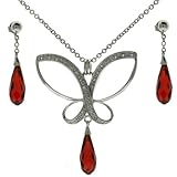 The delightful sterling silver necklace and earring set features a stunning Butterfly pendant. The pendant is adorned with cubic zirconia's and is about 1.75" in length and hung on a 16" chain with a 3" extension. Underneath the pendant is a prismatic red Garnet crystal that dangles from the bottom of the pendant. The earrings also feature the same gem and are attached to a chain resembling in a similar dangle effect. The necklace is rhodium plated, ensuring that this piece will never tarnish or change color. Will be sent in a gift box. Perfect for that special someone. Presented Exclusively by Bucasi