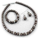 Here is a classic dark brown faux pearl necklace bracelet and earrings set. This lovely set features graduated pearl size - thicker in the front, going smaller towards the back. Also, all pieces are accented with sparkling clear rhinestones. Necklace measures 15" long and can be extended. Comes with matching bracelet and dangle earrings. Your set will come to you in a foil gift box great for gift giving. Box may be a different color than the one shown.