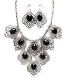 This beautiful set features a cascade of antiqued silvertone leaves accented with faceted black acrylic stones. Necklace has a 4.5 inch drop and measures 18 inches in length. Matching earrings feature wire hooks for pierced ears. Your set will come to you in a lovely organza bag and makes a fabulous gift or treat for yourself. Please see our other listings for more elegant fashion jewelry from Enchanting Jewels.