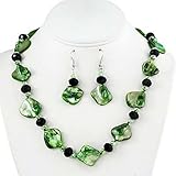 Here is a pretty green shell and crystal necklace and earrings set. This shiny piece has natural green colored shells accented perfectly with black faceted crystals! It measures 16" long and has a 2" extension. Comes with matching dangle earrings. Your necklace set will come to you in a foil gift box great for gift giving. Box may be a different color than the one shown.