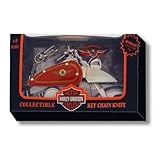 Harley-Davidson is a true American legend and this collectible Harley logo pocket knife was crafted to pay homage to the great American cycle. The piece features a gas tank shaped die cast handle in red emblazoned on both sides with the vintage wing Harley logo, a release mechanism styled after the cycle's rugged instrument panel and comes with a collector's Harley logo pin. With a heavy duty chain and swivel clip, you can wear this on your belt or attach it to a key chain. Be ready for whatever comes your way with this Harley-Davidson pocket knife key chain in red.