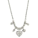Simply charming, this silver tone necklace has a beautiful, thick double cable chain that is adjustable to wear at different lengths. At the center segment, a variety of charms dangle from silver tone beads. The charms include a floral heart, a leaf, and a flower.