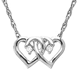 Two hearts sewn together is the classic symbol of love. This ornamental White Gold Double Heart with Diamond-Accent Pendant beautifully showcases two hearts, each with a clear white round diamond nestled in the center in a delicate channel setting. The shine and sparkle of the 14k white gold metal rope chain accentuates the dazzle of the pendant and is securely fastened with a spring-ring clasp. This heartfelt symbol makes an eye-catching gift for the special person in your life.