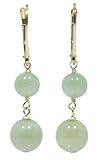 Delicate light green rounds of jadeite dangle from 14 karat yellow gold wires in these beautiful and versatile earrings. Each earring holds a chain of two jadeite beads, graduated in size, with the largest measuring 8 millimeters. These elegant dangles will complement a wide range of outfits. They fasten with simple and secure leverbacks. Jadeite is one of two minerals called jade. (The other is Nephrite.) Regarded in many cultures as a symbol of good luck, jade is said to have a harmonizing effect on its wearer.