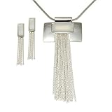 Long " Silvertone Rectangle Pendant with Tassle Necklace and Earrings Set Fashion Jewelry