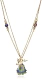 The Lucky Brand "Best Friend Necks" Bird and Peacock Necklace makes for a charming double-strand necklace. The two delicate necklaces are made from gold-toned curb chain and each features its own coordinating pendant. One of the pendants represents a gentle bird in flight, and the other is a peacock feather coated in blue, green, and yellow glossy enamel. The feather necklace is accented with small gold-toned charms containing purple stones and flower embellishments. With a unique clasp system, these can be worn as separate pieces or attached to create a single necklace. Offer one to your closest friend or keep both for yourself for a trendy mix-and-match effect.