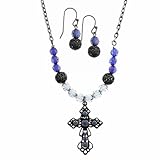This Hematite tone necklace and earring set features beading in hues of Montana and light sapphire blue blended with hematite tone filigree beads. The filigree cross pendant necklace is set with light sapphire and Montana blue hued crystals.
