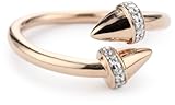 Nicky Hilton's 18k Gold Wash Bypass Spike Ring is sure to add an eye-catching sparkle to any casual or formal outfit. The ring is cut in a traditional bypass shape with two ends crossing past one another on the front. Made from 18k gold-plated 925 sterling silver, the ring is accented with a pair of Nicky Hilton's signature "bullet" spikes. The spikes are lined with tiny white cubic zirconia and feature an elegant rounded point to complete the look. With a narrow cylindrical band that circles around the back, this ring is comfortable and easy to wear day and night. Stack it with other rings in coordinating finishes, or pair with some simple diamond stud earrings for a chic look.