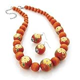 Make a stylish statement with this Orange Floral Wood Bead Necklace & Drop Earrings Set. Featuring a 50cm necklace, comprising of various sized wooden beads in hues of orange, all strung on a cotton cord. The beads decorated with yellow and gold floral pattern, offering a boho style. The matching earrings each feature a ball drop design (about 2cm in diameter) and measure about 4.5cm in length. They have silver tone shepherd's hook fittings, suitable for pierced ears only.