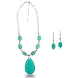 Be an attention-getter with this oversized turquoise teardrop pendant! The teardrop is accompanied by six smaller flat oval turquoises on the chain. The set comes with matching turquoise earrings to complete the look!