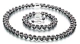 This gorgeous black set is created from genuine high quality freshwater pearls. Carefully grown over many years, they have been gently harvested and matched to the strictest of standards.This set is part of hand selected selection of gorgeous freshwater black cultured pearls.You will adore the flexibility of the 6 to 7mm pearl size. Perfect for both casual and formal events.This value priced A quality set features very nice AA luster, naturally beautiful off round A shape and AA body.And its noteworthy that this set is A quality, the luster of this set is of the higher AA grade and the body is AA which is also higher than the overall grade.This set consists of a beautiful 6 to 7mm black pearl necklace, accompanied by a matching pearl bracelet and a pair of sterling silver lever back post mounted pearl earrings. Included are matching butterfly backs to secure the fine and beautiful earrings. Your set will be carefully packed and shipped to you in an elegant velvet lined box and accompanied by lots of free extras (please see below).And, if you choose, we would be delighted to gift wrap your set and turn this set into an unforgettable gift.