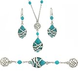 Bucasi offers a full line of exquisitely designed fine department store quality fashion jewelry sets. Make a statement with this mysterious looking simulated turquoise necklace and earring set. The handcrafted brush matte silver-tone plated pendant features an oval resin turquoise with cris-cross design, matching charm and blue multi-faceted beads. The necklace pendant is 1.75" in length while the necklace is 18". The bracelet measures 9" Adjustable. The matching dangle earrings is 2" in length with fishhook backings. The 3-Piece set is rhodium plated to ensure that each piece will never tarnish or change color. Nickel Free. Presented in a gift box. Exclusively by Bucasi