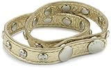 For a unique twist on the traditional stud bracelet, choose the Exclusive Double-Wrap Screw Gold Metallic Bracelet by Rebecca Minkoff. Made from a 16-inch long narrow band of gold-colored leather, this bracelet wraps to look like a double-stranded cuff. The leather band is studded all the way around with silver-toned screws creating a rocker-glam look. Closing easily with a simple snap at one end, the bracelet is adjustable to fit many wrist sizes. The quality stitching and hardware make this piece great to wear every day for your own personal style. Layer this edgy piece with other bracelets for a trendy, casual look, or wear it with a few chunky cocktail rings for a contemporary, eclectic effect.