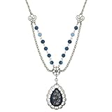 Let bold blue beads cascade down your neckline with this enticing and unique pendant necklace. A shining silver tone French rope style chain connects to the layered chains at the center by two swirl heart designs. One of the layers below the hearts is a strand of royal blue glass lapis fossil beads that give off a casual cool vibe. The teardrop shape pendant is enameled in the same tone of blue as the beads and is decorated with a silver flower design and unique large scalloped edges.