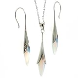 The translucent opal looking crystal in a stunning necklace with pendent and earring set. This handmade set is set in .925 sterling silver. The silver is rhodium plated and is tarnish free. Necklace measures: 16" and Dangle Earring Measures: 2.0" Length. The set come complete in a Bucasi gift box. Exclusively from Bucasi. Great Gift and Price!