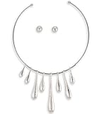 Add a bit of drama with a unique necklace. This choker style necklace is 14 inches in diameter so it sits higher up on the neck to allow for the dangles. Made from hypoallergenic metal, the matching earrings are included.