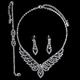 This fancy design jewelry set comes with matching necklace, earrings and bracelet. Set in silver tone metal alloy and dazzled with rhinestone crystal. Necklace measures 13 inch with 4 inch extension. Earrings measure 1.75 inch tall. Bracelet measures 7 inch with 2 inch extension. A beautiful matching jewelry set gift for wedding party and bridesmaid gift. Style number #s065.
