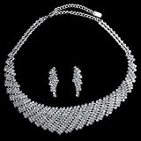 This choker design jewelry set comes with matching necklace and earrings. Set in silver tone metal alloy and dazzled with rhinestone crystal. Necklace measures 15 inch with 4 inch extension. Earrings measure 1.5 inch tall. A beautiful matching jewelry set gift for wedding party and bridesmaid gift. Style number #s074.