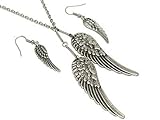 Here is a trendy silvertone metal angel wing pendant necklace and earrings set. This pendant measures approximately 3/4" wide and 2 1/4" long and hangs on a 21" long silver chain with an extention. Comes with matching dangle earrings. Your necklace and earrings set will come to you in a foil gift box perfect for gift giving. Box may be a different color than the one shown.