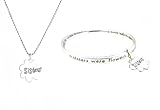 Bracelet is inscribed with "If Sisters Were Flowers, I'd Still Pick You. I'd Let the Sun Shine So You'd Never Be Blue. I'd Show the World How Beautifully You Grew, With Bright Bold Colors and Strength Through and Through" all the way inside and around plus has a dangling flower-shaped "Sisters" charm. Matching necklace is this same dangling flower charm hung on a 17-1/2" 1.5 mm ball chain. Charm measures approximately 7/8" in diameter. Bangle bracelet measures 2-11/16" (approx 68mm) in diameter and is nicely weighted. Both bracelet and necklace are made of silver tone lead-free base metal.
