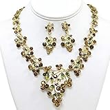 Here is a gorgeous goldtone topaz rhinestone necklace and earrings set. This 16" long necklace branches around your neck beautifully and comes with a 2" extension. You will find topaz, green, and gold rhinestones on this most elegant piece! Comes with matching dangle post earrings.