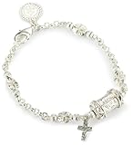 This silver tone prayer bead bracelet features a cross charm with a small dove etched at the center, alongside a barrel bead with the words “pray for us Mary, model of faith, hope, and love” words engraved in small letters.