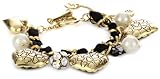 The Betsey Johnson "Lovely Leopard" Heart Ribbon Bracelet is the ideal mix of wild and sweet. A toggle clasp holds a thick gold chain laced with a black satin ribbon, while faux pearl beads, engraved gold-toned hearts, and a sparkling rhinestone-encrusted sphere dangle around the edges. Betsey's initial carved into a pair of tiny gold discs at on the ends of two smaller chains completes the look! Pair this pretty bracelet with a full vintage skirt, cardigan, and kitten heels for retro-inspired style.