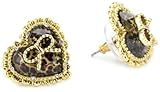 Mix it up with the edgy Betsey Johnson "Lovely Leopard" Heart Stud Earrings. Each bullet-clutch-with-disk post holds a gold- and rhinestone-trimmed heart filled in with polished resin in Betsey Johnson's signature bronze and gold leopard print. A sweet chain bow completes the look. These earrings have just a touch of glitter, yet pack enough punch for a glam ensemble. Pair these earrings with a deep V-neck jumpsuit, piles of gold chain necklaces, and shiny patent heels for a red-hot night out!