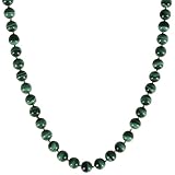 Malachite beads display their striking color--deep green with a banded light green pattern--in this elegant beaded necklace. The 17-inch strand holds 49 polished rounds (8mm) of malachite and fastens with a 14 karat yellow gold lobster claw clasp. To maintain the beauty of these distinctive beads, clean them gently with a soft cloth and avoid solvents.