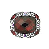 This red brooch is the perfect accessory to add to your winter coat! A rectangular, multifaceted red jewel is framed with a hematite tone swirl design bedecked with aurora borealis crystals. At the four rounded corners, petite red jewels add a touch of extra sparkle.