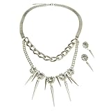 Here is an edgy silvertone crystal and spike dangle necklace and earrings set. This necklace has a mesh chain that is 16" long and can be extended to 18." It has flower-like designs with center crystals bordered by smaller crystals and hanging silver spikes beneath them! Comes with matching earrings. Your necklace and earrings set will come to you in a foil gift box great for gift giving. Box may be a different color than the one shown.