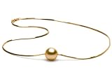 This elegant necklace showcases a single large, brilliant Golden South Sea pearl. The perfectly round, AAA/Gem quality pearl has a deep iridescent golden color, and very thick nacre with a rich shine. It is suspended on a sleek, 14 karat gold chain.