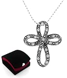 A sparkling expression of antiquity! This elegant, antique style cross is both a symbol of inspiration and a striking yet classic fashion statement. Featuring filigree designs, classic ornamentation, genuine Austrian crystals, marcasite-style design and 18" diamond cut, shimmering ball chain. Delivered in elegant, black velvet hinged gift box. Pendant measures approx. 1" wide. Sterling Silver plated.
