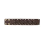 Wide leather cuff bracelet has X design. Bracelet is 1-1/2 inches wide and has brass snaps to adjust the length from 7-1/2 to 8-1/2 inches.
