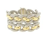 This stunning designer inspired bracelet features a unique cable woven pattern embellished with two-tone metals consisting of sterling silver and brass. �The two metals are plated with rhodium to allow for a tarnish resistant finish. �The silver and gold tones decorating this fashion bracelet make it a versatile addition to your accessory collection. �Wear this designer inspired bracelet with both silver or gold tone jewelry on all occassions. �Pair the bracelet with a casual daytime outfit to add a touch of class or wear it with evening attire to stand out in a crowd. �Either way you choose to wear this bracelet, you will be sure to get compliments. �This fashion bracelet is inspired by modern day high end designers but comes with an affordable price. �This substantial piece of jewelry is certain to last for years to come. �This sterling silver bracelet measures 7.5 inches long and is 1.5 inches wide. �The decorative cable clasp features a strong magnetic clasp that closes on both ends with an additional fold over clasp so that this bracelet stays securely in place. �The magnetic closure makes this bracelet easy to take off and on by yourself. �Buy one today for yourself or for a gift while quantities last.