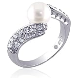 This gorgeous ring is crafted from Rhodium Plated .925 Sterling Silver and set with a 8mm White Cultured Pearl in a unique Bypass Design that is richly enhanced with sparkling White Pave Set Cubic Zirconia. This modern Bypass style Dress Ring will accentuate your elegant style. The ring comes in size 6(available only in size 6). This ring has a top dimension of 7/8 inch x 3/8 inch and weighs 3.26gms. Comes with a 100% Money Back Guarantee, Gift Box and FREE SHIPPING.