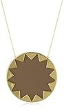 A superb combination of materials, Nicole Richie's House of Harlow 1960 Large Sunburst Pendant is an original beauty. A large, 14k gold-plated, disk is centered with a khaki leather starburst. The chunky pendant is fastened on both sides at the top to a 14-inch fine link chain that fastens with a lobster-claw clasp. This is a look that says "today," in the way only Nicole Richie can. Pair it with jeans and a leather blazer on the weekend, or wear it to the office and make a contemporary professional statement.