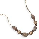 Copper necklace has 10mm shell based pearls and 9mm x 13mm jasper beads. This necklace has a hook style closure and is 19 inches in length.