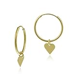 These pretty earrings feature an endless polished 13mm mini hoop with a dangling flat heart. The earrings are crafted of 10k yellow gold and are secured with a seamless closure.