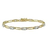 A gemstone tennis bracelet design filled with bold blue color, the 18k Gold Plated Sterling Silver Diamond Accent and Blue Topaz Double Bar Link Bracelet is full of classic design and elegant sparkle. This fine bracelet displays a pattern of oval-shaped metallic links in cheerful yellow gold and oval-shaped blue topaz stones touched on either side by a sparkling natural white diamond. The 7.25-inch bracelet keeps a secure hold with a box-with-tongue and safety clasp.