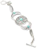 Tastefully bejeweled with bright turquoise, the Etched Metal Flex Bracelet in oxidized silver-tone metal adds welcome retro ornamentation to casual or dressy outfits. The round moon centerpiece is flanked by crescents and feather-shaped components, all linked and embellished with gorgeous vine and floral patterns. But the interest doesn't end there--turn the piece over and you'll see intricate detailing on the back. Because each component of this 7.5-inch bracelet is linked, it'll flex comfortably around your wrist. Secure this statement piece with the signature toggle clasp and let it summon the best of your desert gypsy leanings.