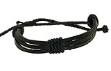 Made of 3 straps of real black leather & tied together with black cord at each end and in the middle. Adjustable so one size fits all - simply widen to desired size slip on then pull cords to tighten. Approximately 1 cm wide & 3mm thick. A nice & stylish bracelet suitable for anyone.