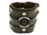 Made of real dark brown leather this bracelet combines both style with comfort. The leather cuff is approximately 7 cm wide. Has 5 holes for adjusting and is adjustable from approximately a maximum wrist circumference of 22 cm (8.5 inches) to approx 17 cm (6.75 inches). A cool looking Gothic style leather cuff bracelet. Please note the bracelet may not have the stitching on the straps as shown & the size of the studs and metal ring may vary slightly.