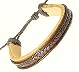 Made of genuine leather & cord. Adjustable so one size fits all - simply widen to desired size slip on then pull cords to tighten. A nice light & stylish bracelet suitable for anyone. . .