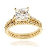 18k Gold over Silver Diamond Bridal Ring Set. This magnificent set features two separate rings encrusted with dazzling diamond accent. This jewelry set is crafted of 18-karat yellow gold over sterling silver and includes an eternity band with diamond accent and one bridal engagement ring. Style: Set. Set includes: Bridal ring, wedding band. Gemstone colors: White. Gemstone shapes: Round, square. One square-cut prong-set Diamond simulant measures 7 mm wide x 7 mm long. Pave-set round-cut diamond accent each measure 1.3 mm. Metal: Gold over silver. Finish: High polish. Metal weight: 6.5 grams. Ring setting dimensions: 7 mm wide x 7 mm long. Band dimensions: 2 mm wide. Available Ring Size(s): 5, 6, 7, 8, 9, 10, 11, 12.