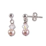 Sweet little pink to peach natural color pearls topped with genuine Swarovski Elements AB rainbow finish crystals dangle from solid ball post earrings of sterling silver. �Size of pearls are 4 to 5mm and crystals are 4mm. �Shades of pearls will vary from pinkish to peach. �All metal is .925 sterling silver, lead free. Made in the USA with genuine Swarovski Elements crystals.