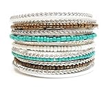 Set of 14 Silver Toned Bangle Bracelets with Turquoise, White, and Brown Beads - Lead and Nickel Free